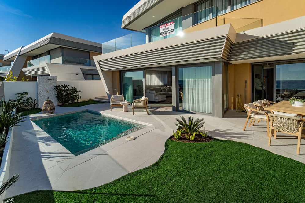 This property in Marbella boasts stunning sea views, but the original garden did little to enhance its potential. The floating tiles, combined with mismatched sizes, created an unappealing dark grid effect, while the small pool felt cluttered by two large, cheap-looking metal steps. The unattractive outdoor shower, positioned too close to the edge, also made part of the space unusable.