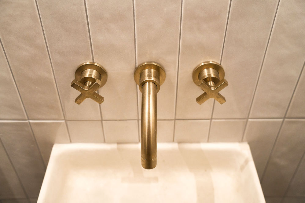 A wall-mounted concrete sink and putty-coloured toilet save space, while brushed brass fixtures introduce warmth and opulence. A round mirror softens the linear tiles, and globe wall lights create a warm, inviting ambience. The mix of textures, patterns, and materials transforms this overlooked area into a stylish, functional space.