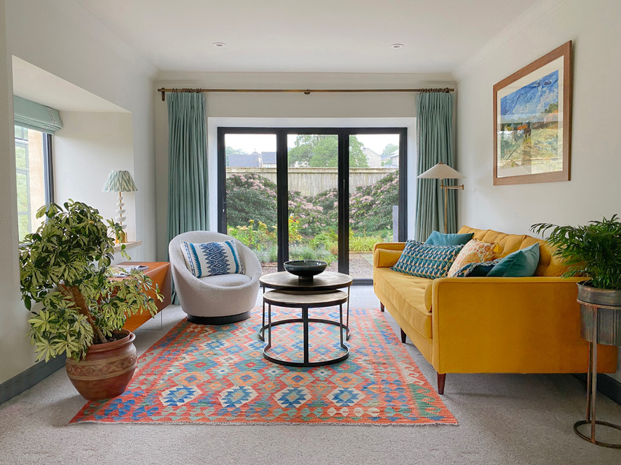 To create a space that resonated with these themes, we initiated the process by opening up the room to take advantage of the garden views and natural light, achieved through the installation of sliding doors. We then tackled the challenge of a narrow room layout, which was somewhat awkward due to bulky, high-armed sofas. We opted for a single, lower, and elongated mid-century-style sofa, complemented by a swivel chair positioned opposite to enjoy garden views and interact with the sofa.