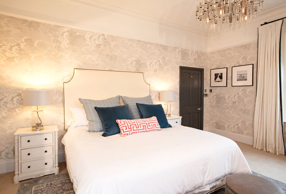 To address this challenge, we chose a calming soft grey wallpaper, crafted a custom headboard, window treatments, and cushions using an elegant Thibaut red fabric with Oriental influences. Considering the client's habit of working on a laptop while sitting up in bed, we chose a white fabric for the headboard and selected a stain-resistant, wipeable material to ensure durability and ease of maintenance. Additionally, we designed generously sized continental cushions that serve as both backrests and headrests, enhancing comfort and safeguarding the fabric from everyday wear and tear.
