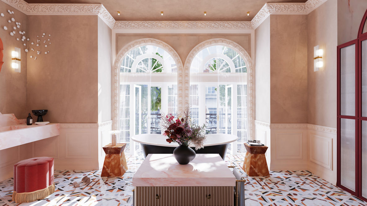 The client wanted an ensuite that felt bold, beautiful, lavish, and indulgent, giving us full creative freedom to design a unique, tailored space. The colour scheme was inspired by the vibrant mosaic floor tiles in pink, white, burgundy, burnt orange, and grey, setting a playful tone.